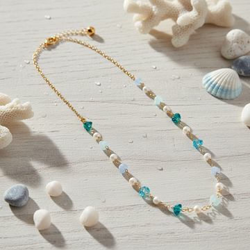 Trendy gold-tone chain necklace adorned with blue stones and pearls. Lightweight, skin-friendly, and perfect for...