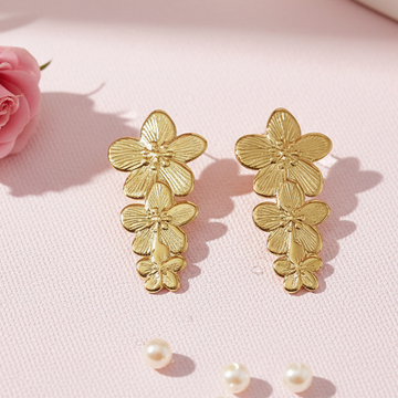 Elegant cascading floral drop earrings with textured flower design and glossy gold finish. Lightweight imitation...