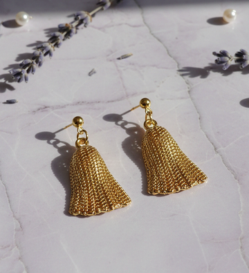 Chic tassel drop earrings with flowing gold chains and glossy finish. Lightweight imitation jewellery perfect...