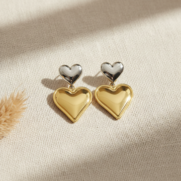 Elegant heart drop earrings featuring layered heart design and polished gold finish. Lightweight jewellery ideal...