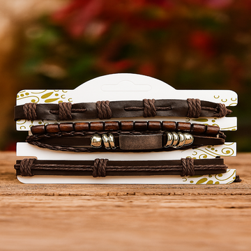 Stylish set of 4 brown bracelets featuring braided leather, dual-tone beads, and layered straps. Perfect...