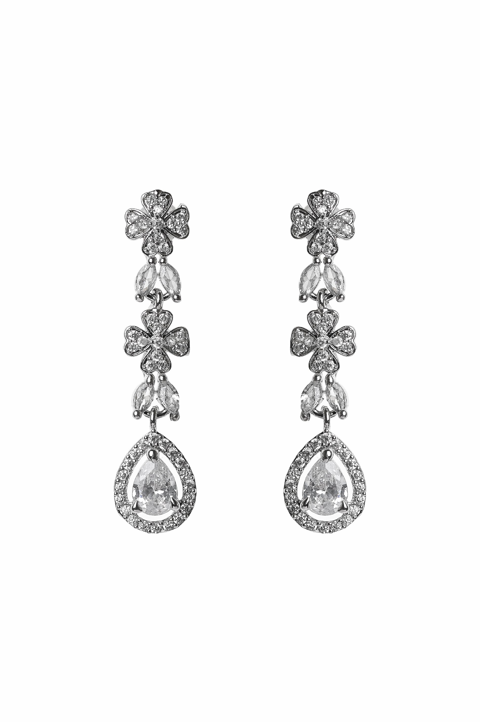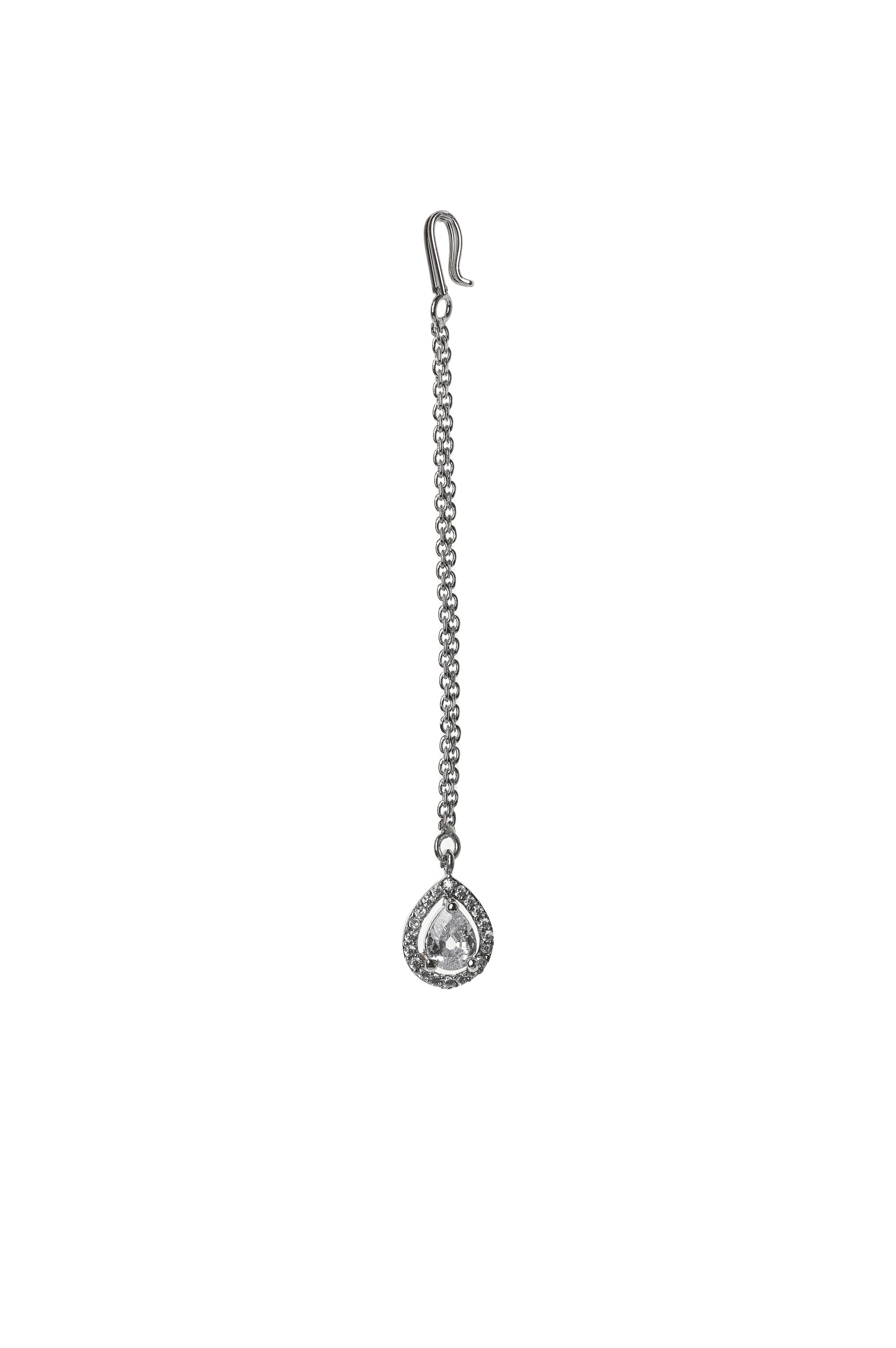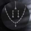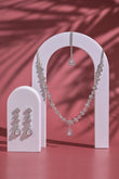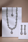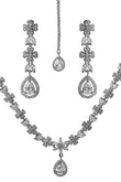 Grace meets glamour in this floral-inspired necklace set, featuring sparkling CZ diamonds, along with matching earrings and a teardrop maang tikka. Crafted in a silver-tone finish, this piece is perfect for brides, festive wear, or elegant evenings. Light, luxe, and timelessly feminine.
