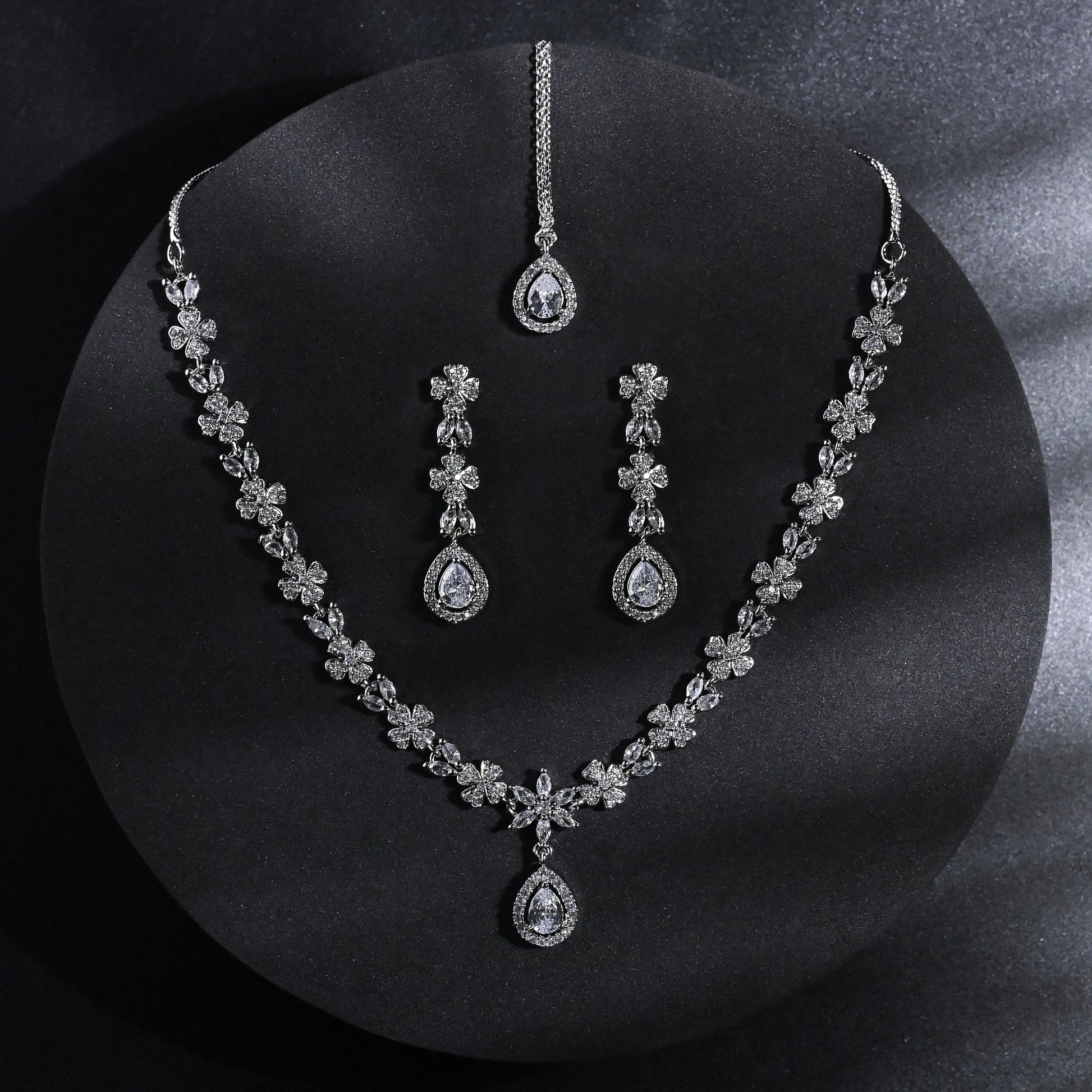 AD Floral CZ Diamond Necklace Set with Earrings & Maang Tikka