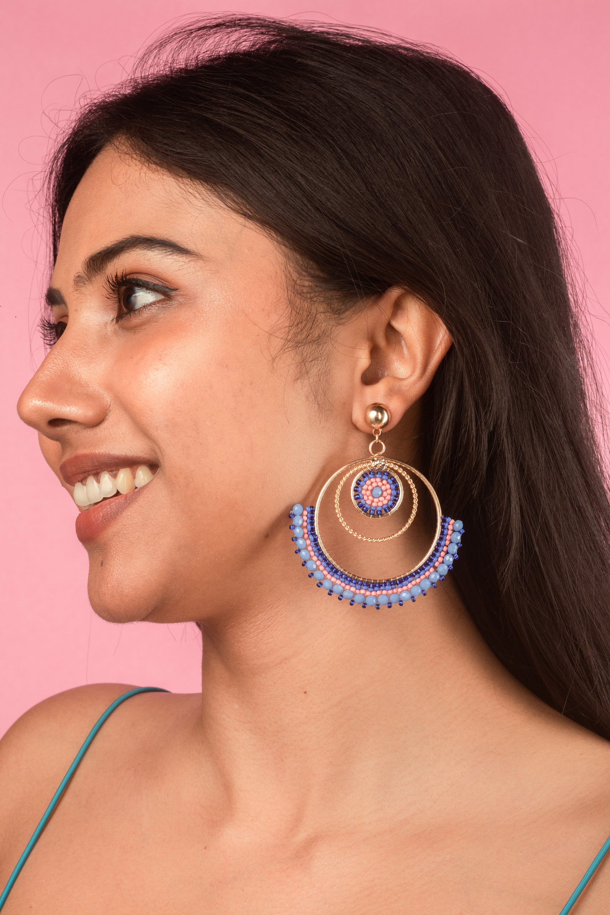 Add a touch of charm to your ensemble with these stunning blue and pink beaded hoop earrings. Featuring dual golden hoops with intricate beadwork, they blend elegance and fun effortlessly. Lightweight and stylish, these earrings are perfect for day-to-night looks, festive events, or casual chic wear. A beautiful fusion of modern design and handcrafted detail.