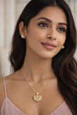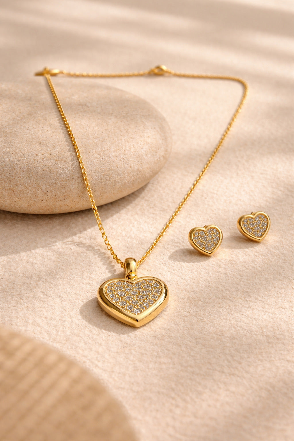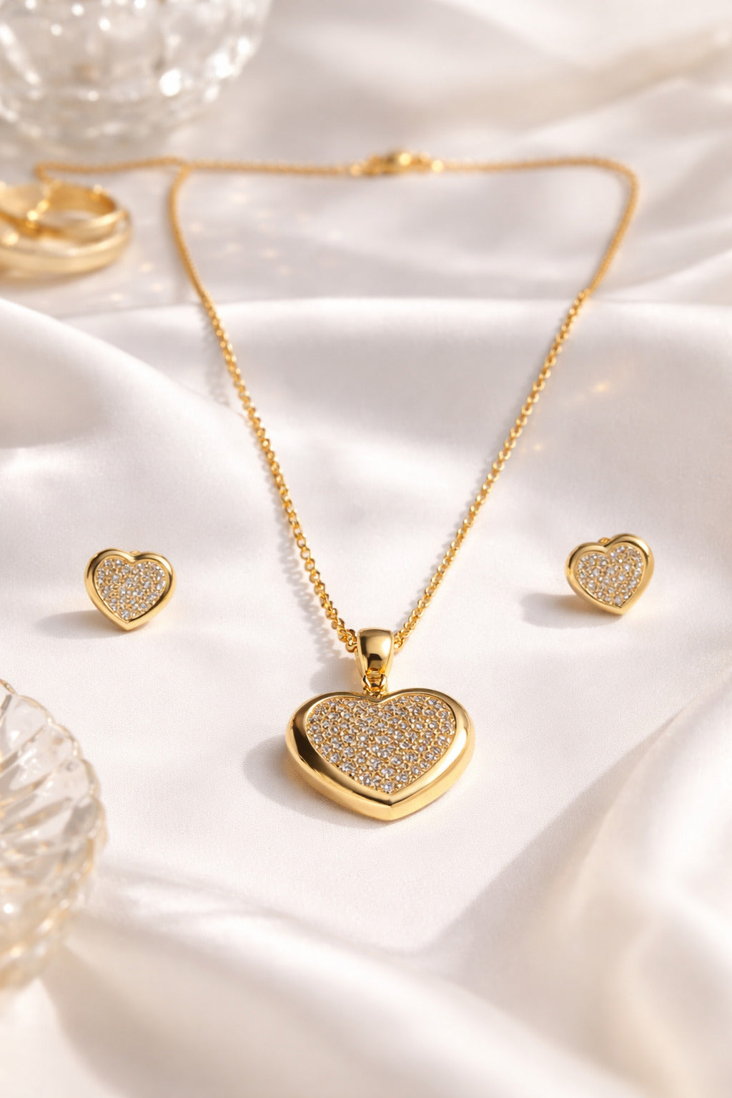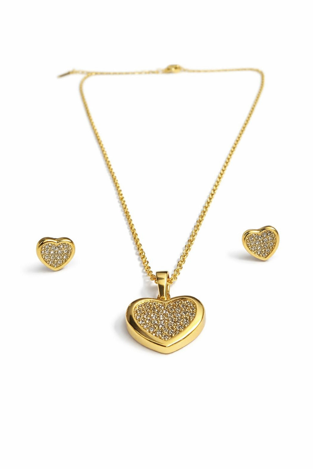 Elegant gold-tone jewelry set featuring a crystal-studded heart pendant with matching heart studs. Lightweight and perfect for romantic or festive occasions.