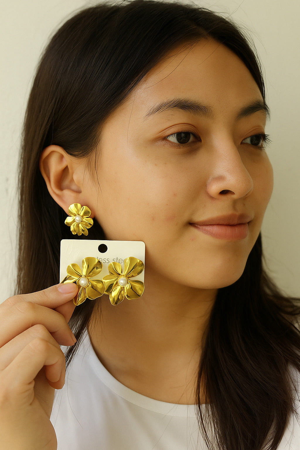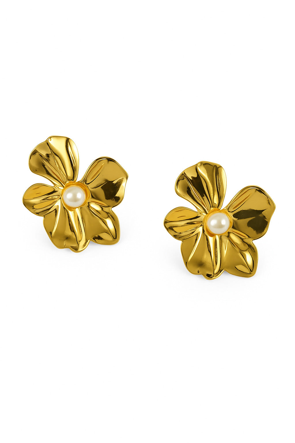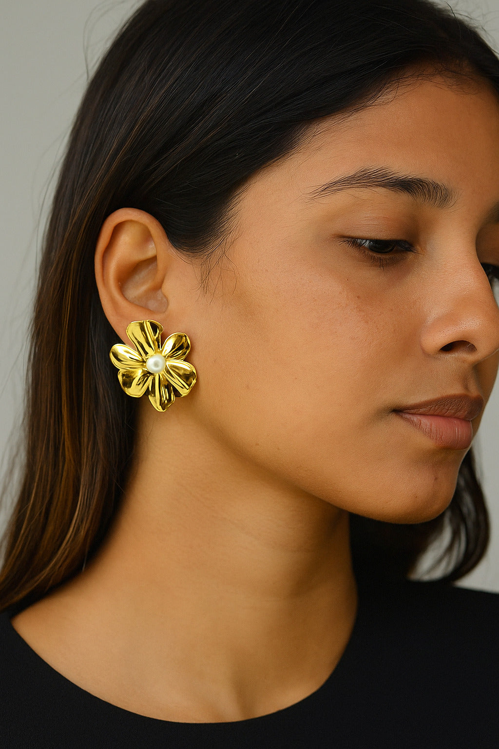 Brighten your look with these striking gold-tone floral stud earrings, showcasing textured petals and a glossy pearl centre. Made from stainless steel, these earrings are lightweight yet impactful—ideal for brunch dates, parties, or festive occasions.