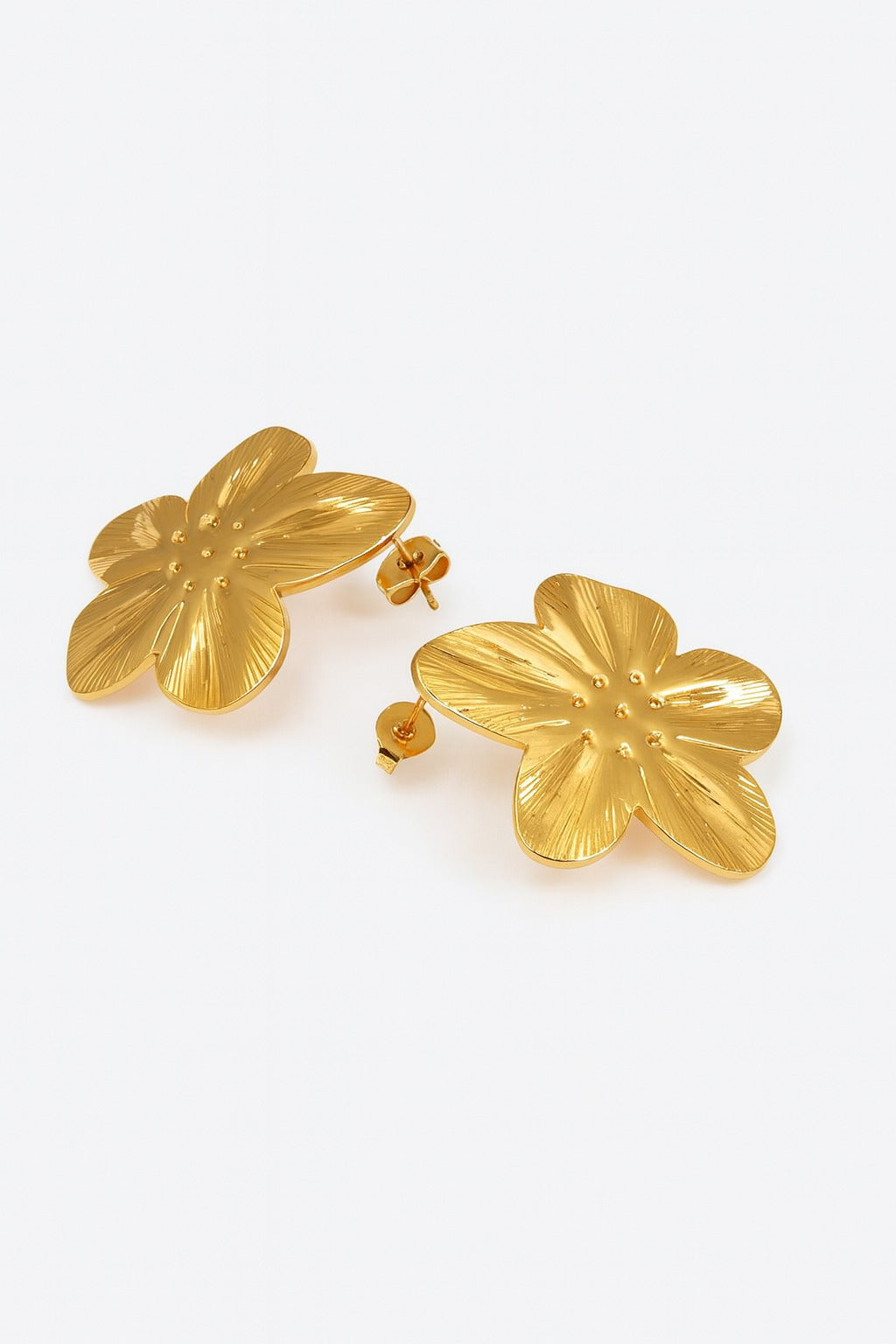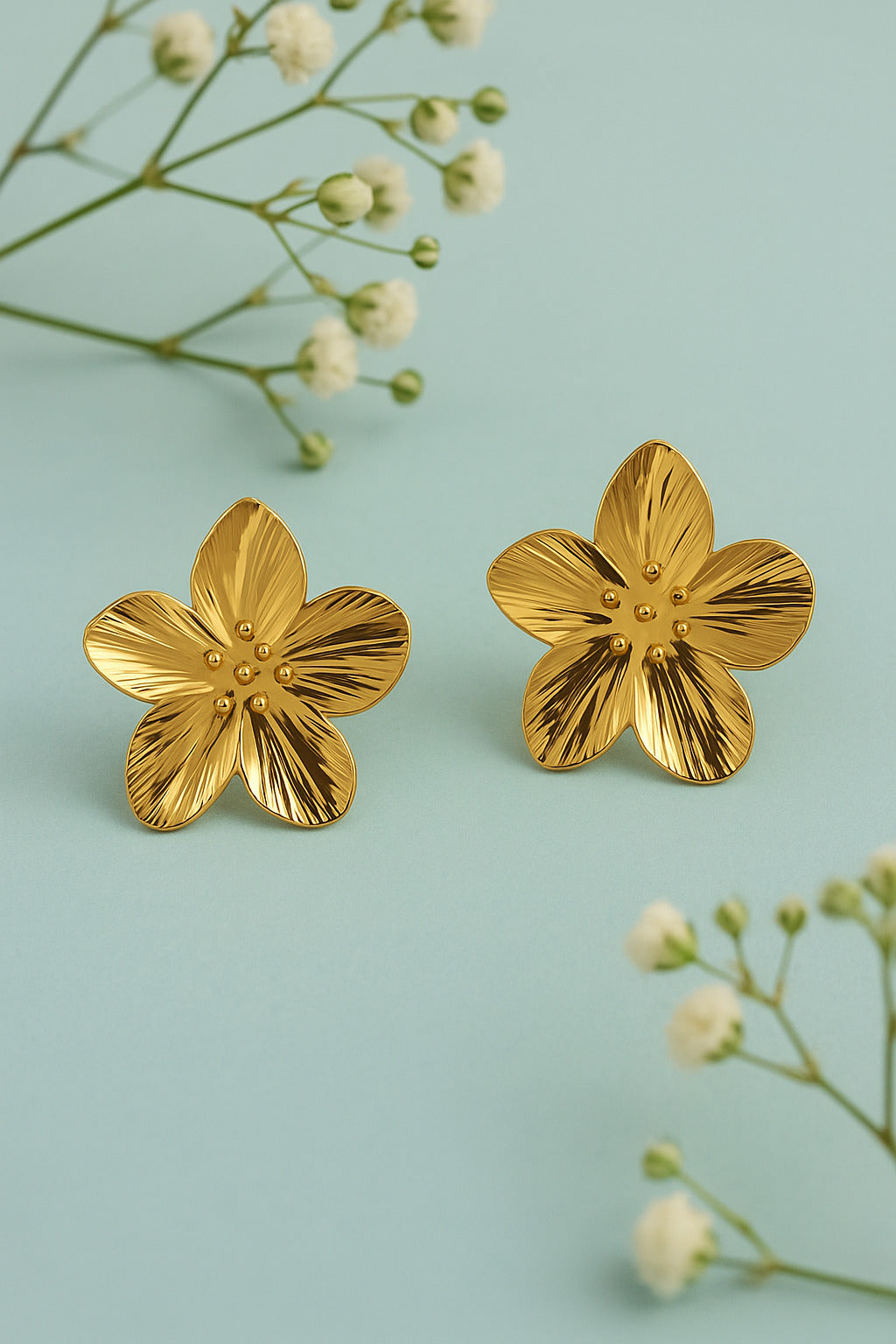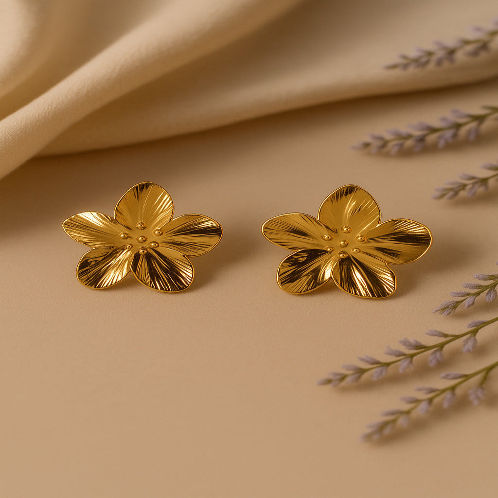 Elegant flower-shaped stud earrings crafted in a polished gold-tone finish. Lightweight, timeless, and perfect for everyday wear or festive styling.