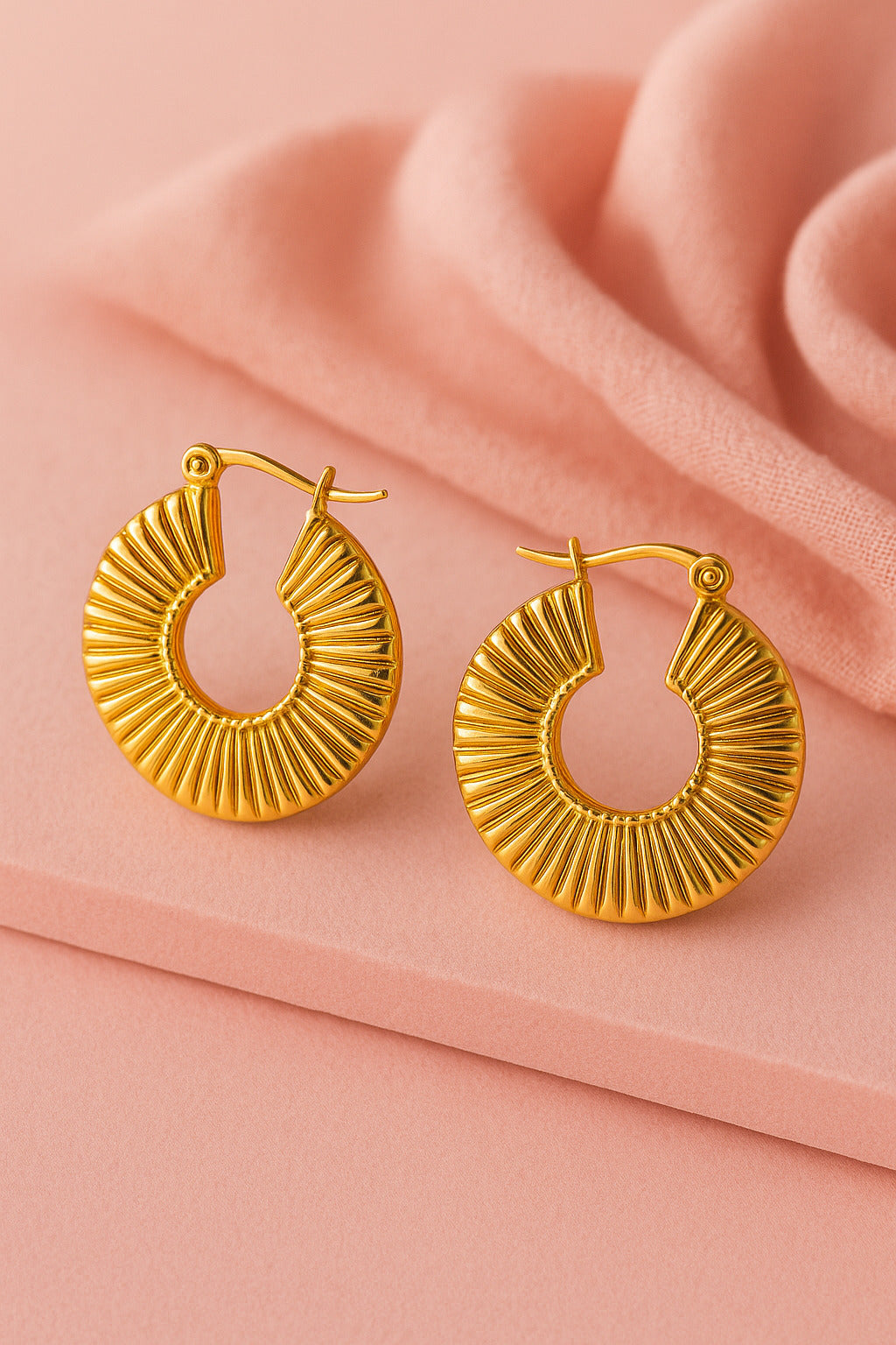 Bold gold-tone hoop earrings featuring a ribbed textured design. Lightweight yet striking, perfect for everyday styling or statement looks.