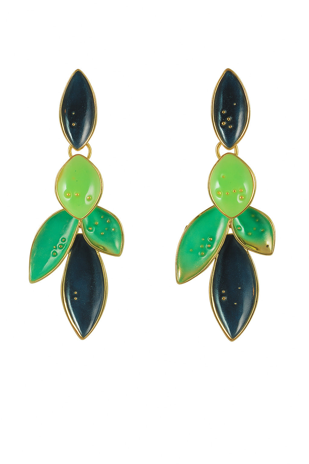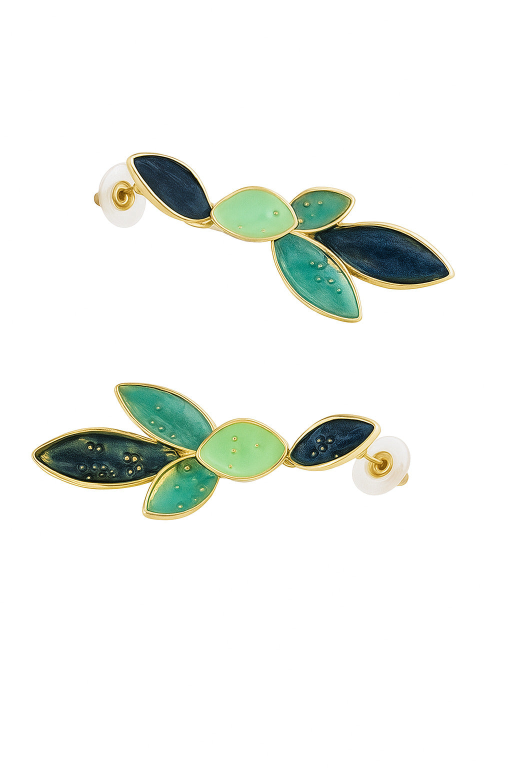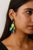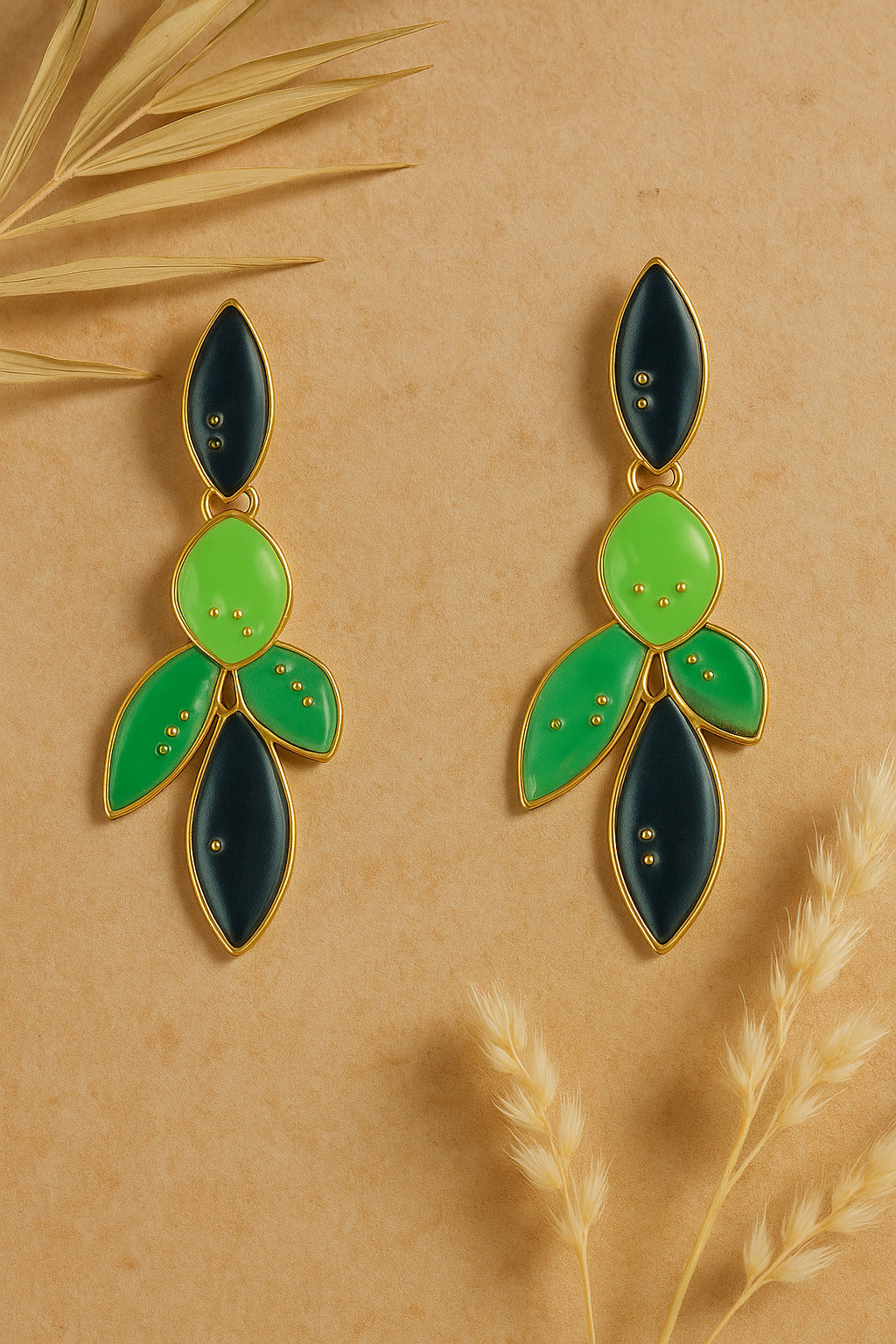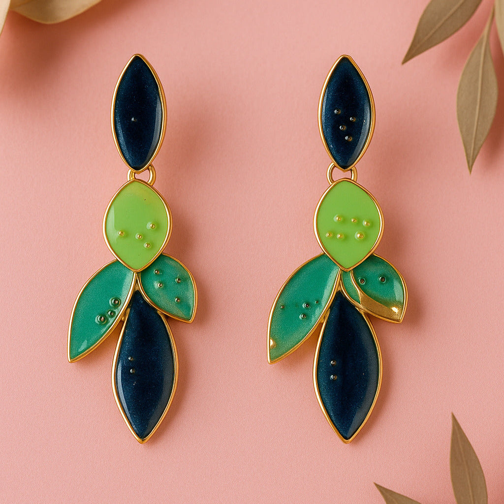 Stylish drop earrings featuring green and navy leaf-shaped stones in a gold-tone setting. Lightweight and vibrant, perfect for adding a pop of colour to your casual or festive look.