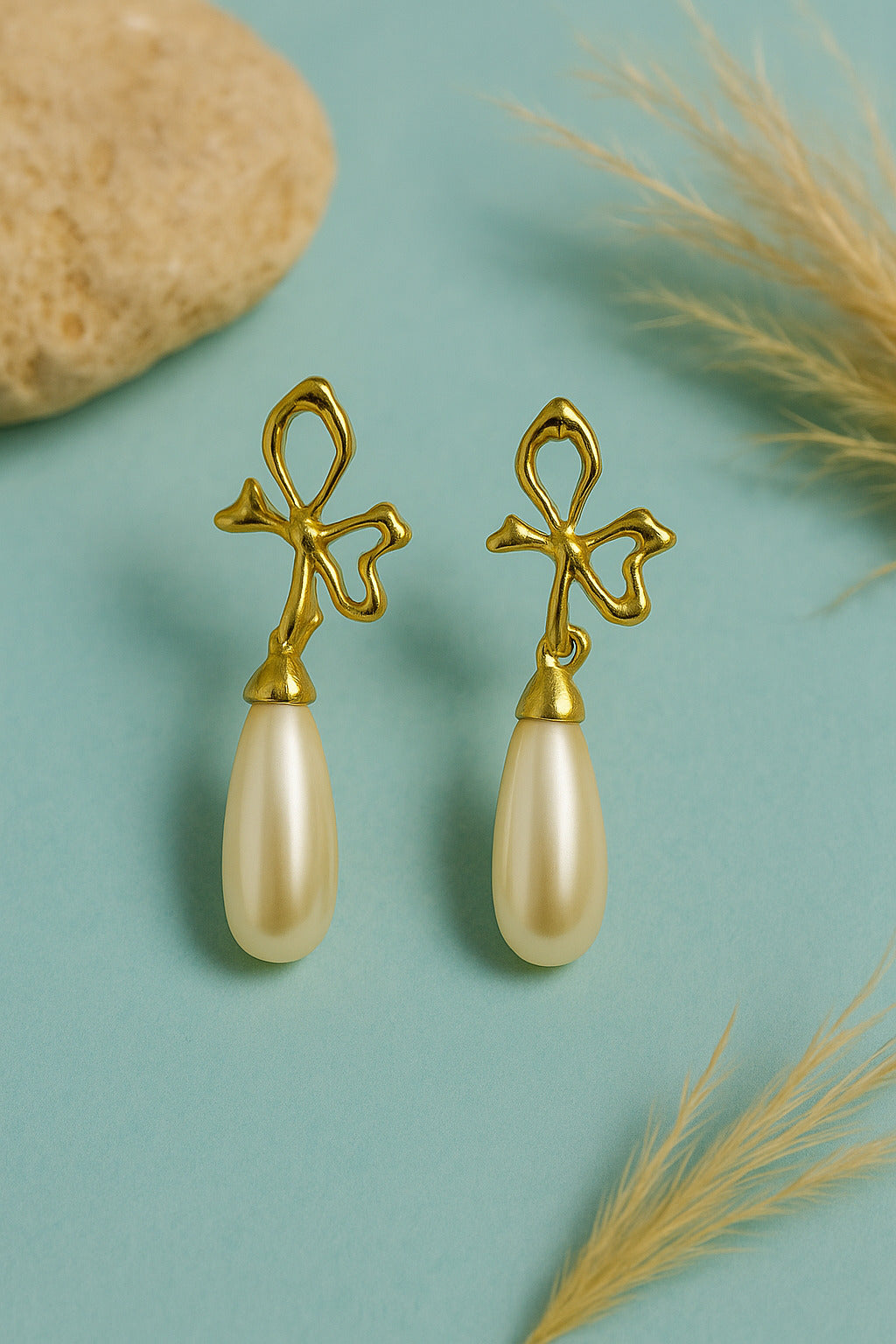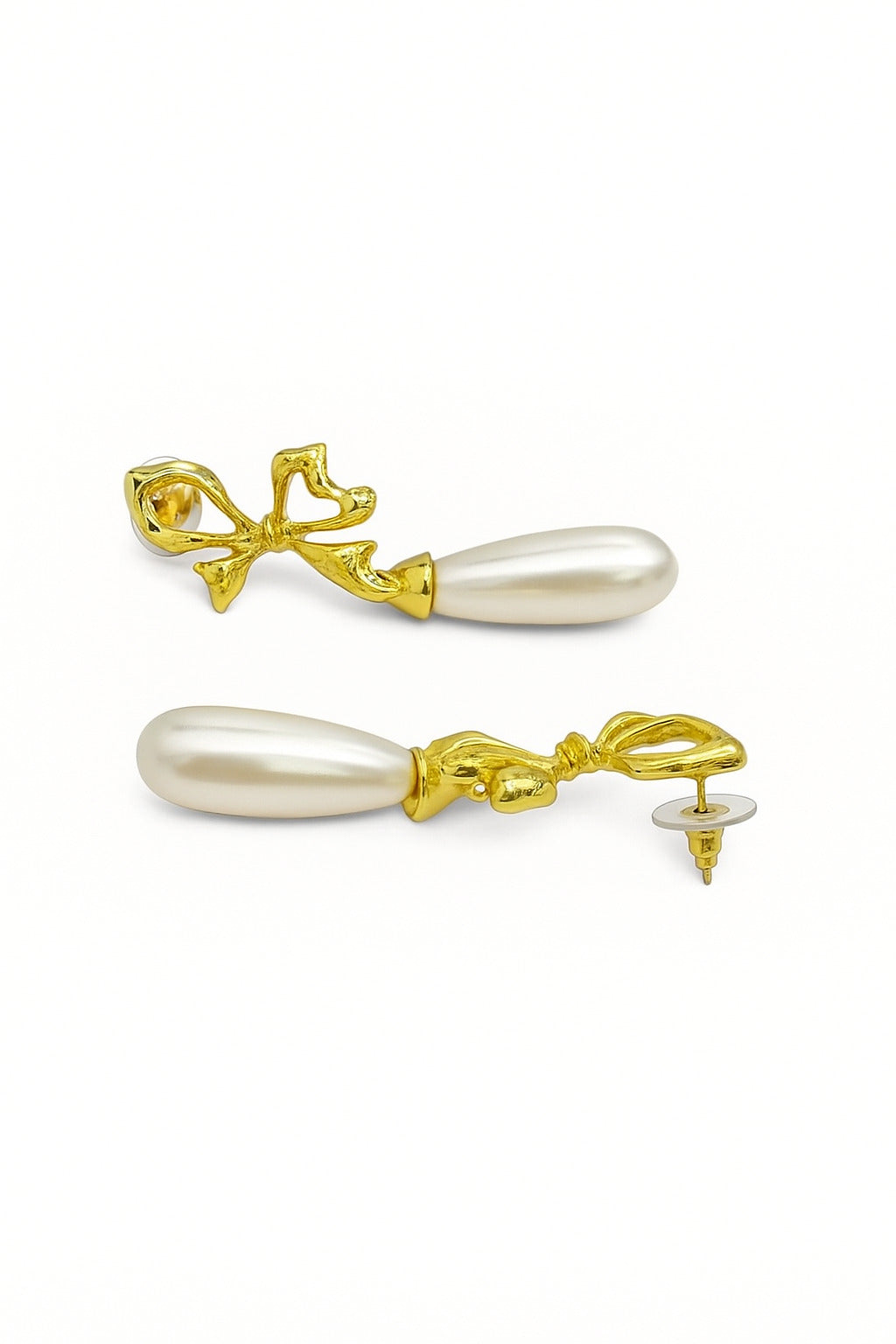 Stylish gold-plated bow earrings paired with glossy pearls. Lightweight and ideal for both casual and party wear.
