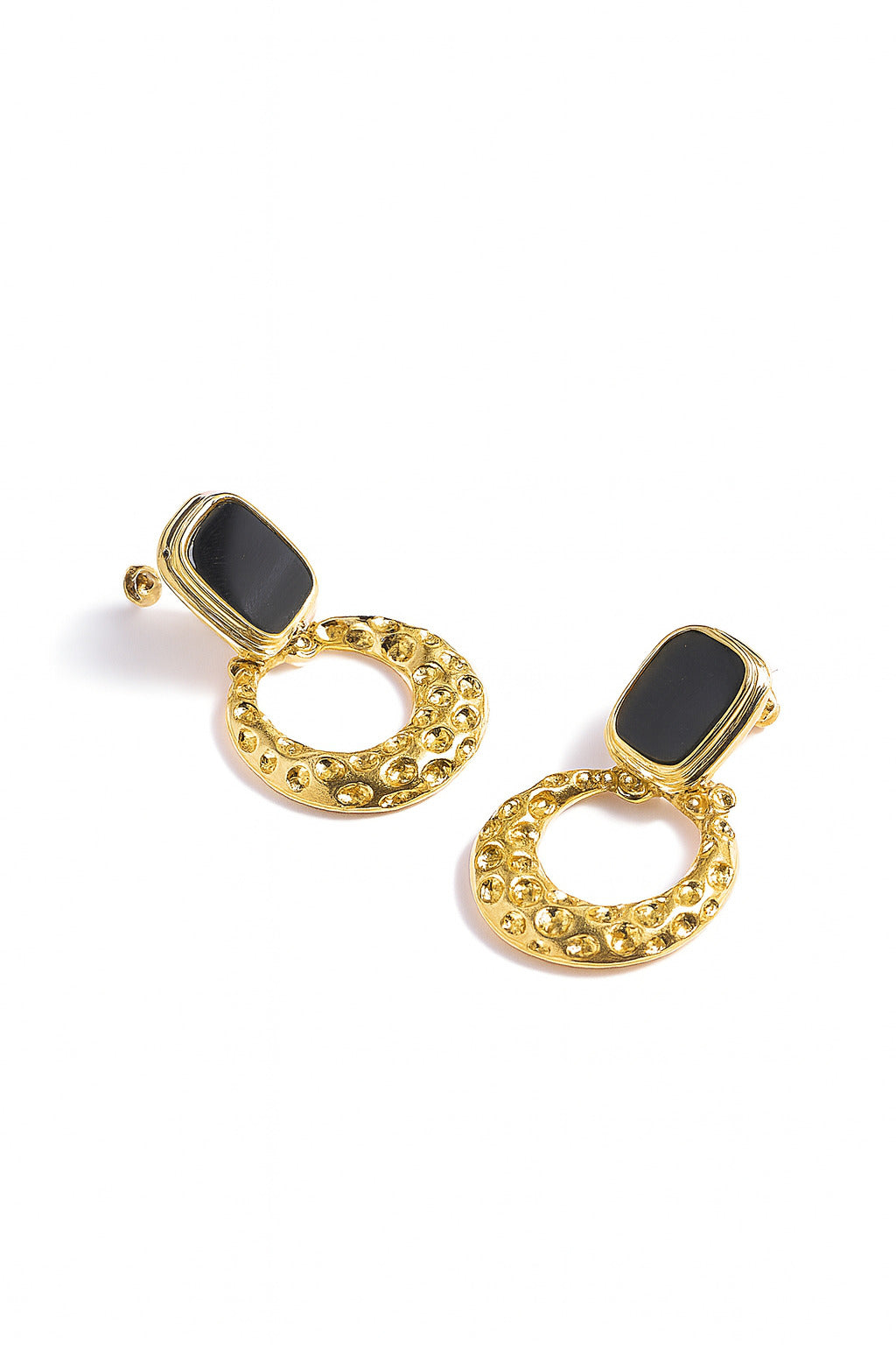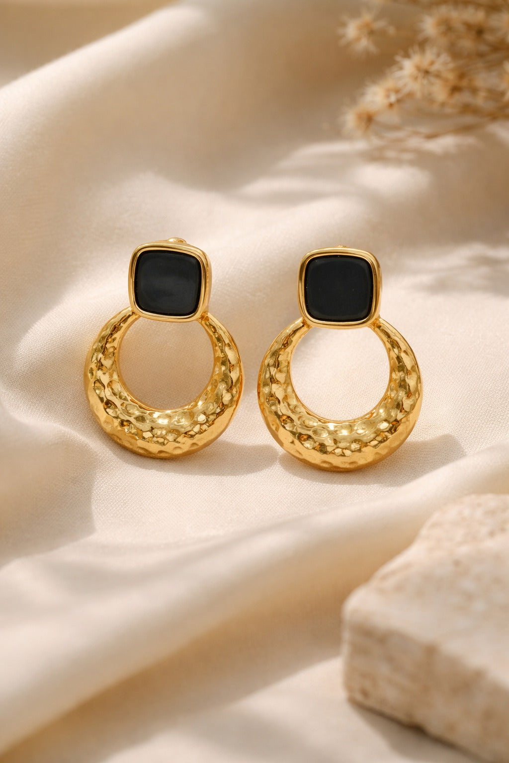 Trendy statement earrings with a black stone accent and hammered gold finish. Adds a modern edge to western, fusion, and evening outfits..