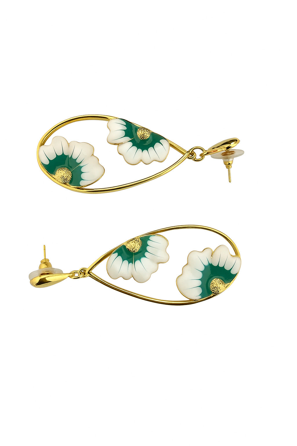 Premium gold-tone earrings with enamel flower accents in green and white โ ideal for weddings, parties, and daily elegance.