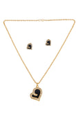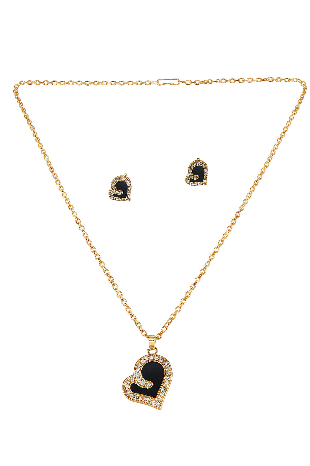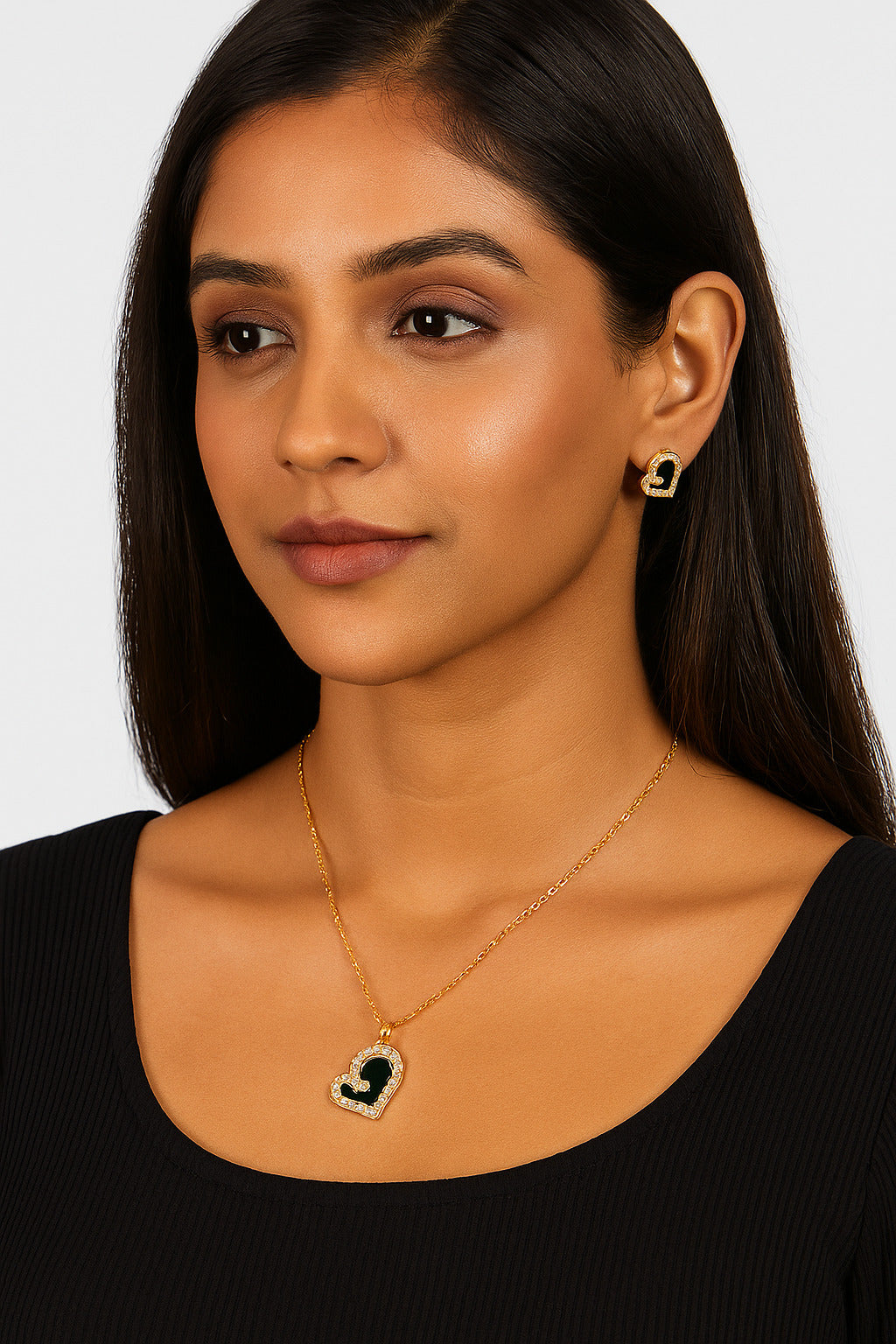 Add a cute yet classy touch to your look with this gold-tone jewelry set featuring a black heart pendant necklace and matching heart-shaped stud earrings. Accented with shimmering stones, this lightweight set is perfect for daily wear, gifting, or casual chic styling.