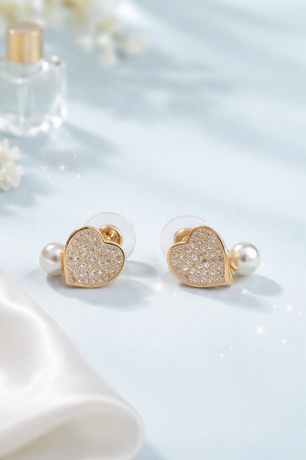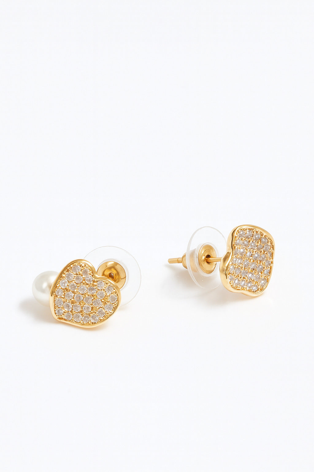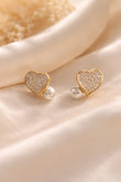 Elegant heart-shaped stud earrings featuring crystal sparkle and a soft pearl accent. A timeless accessory for office wear, casual outings, or festive styling.