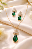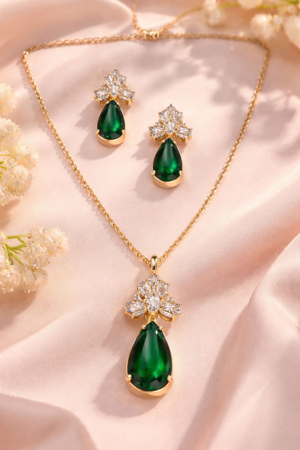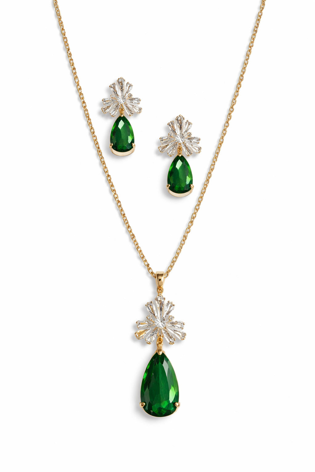 Minimal yet luxurious necklace and earrings set with rich green crystals and delicate sparkle. Lightweight, elegant, and ideal for refined festive styling.