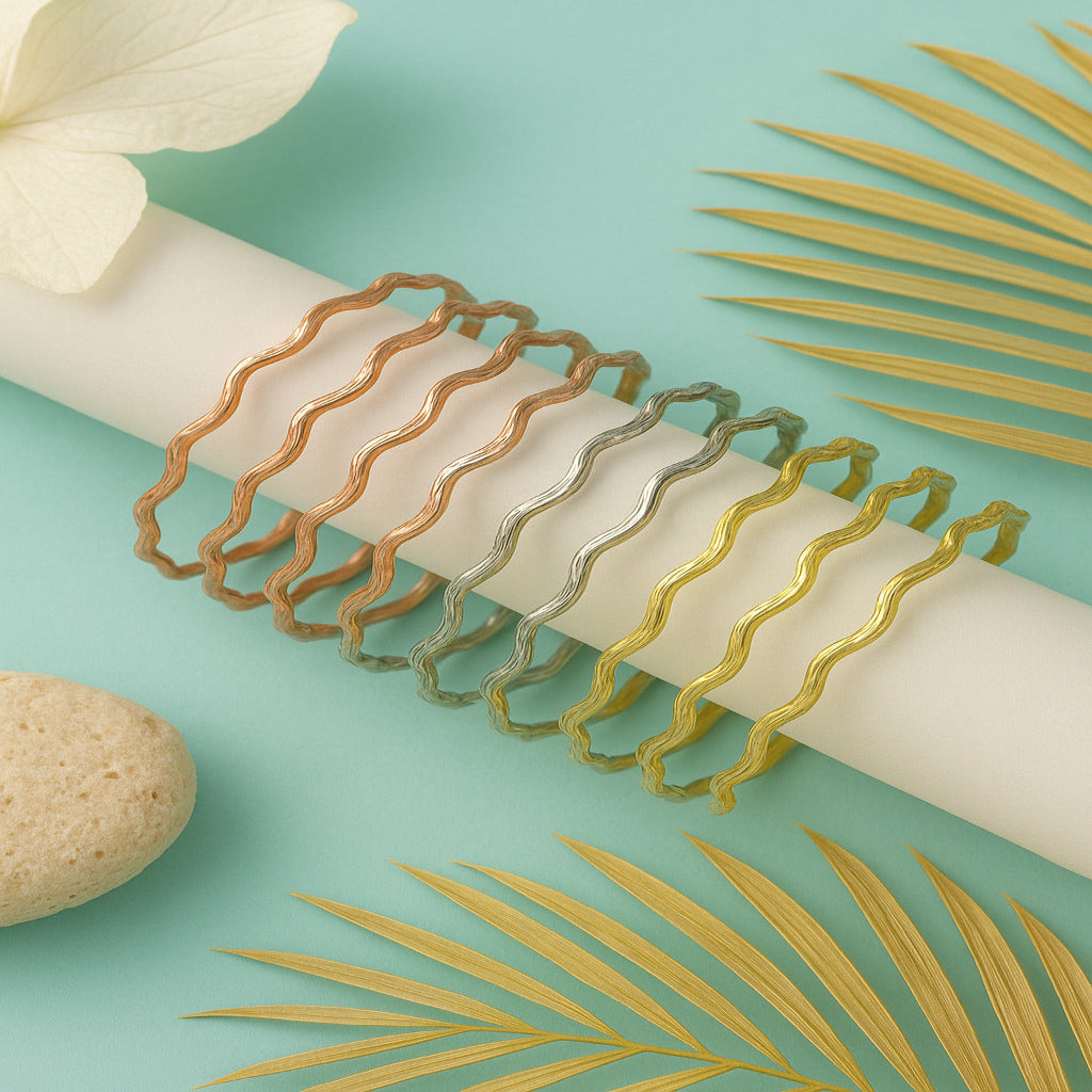 Trendy wavy bangles in gold, silver, and rose gold tones. Lightweight, glossy, and perfect for stacking with festive or casual wear.