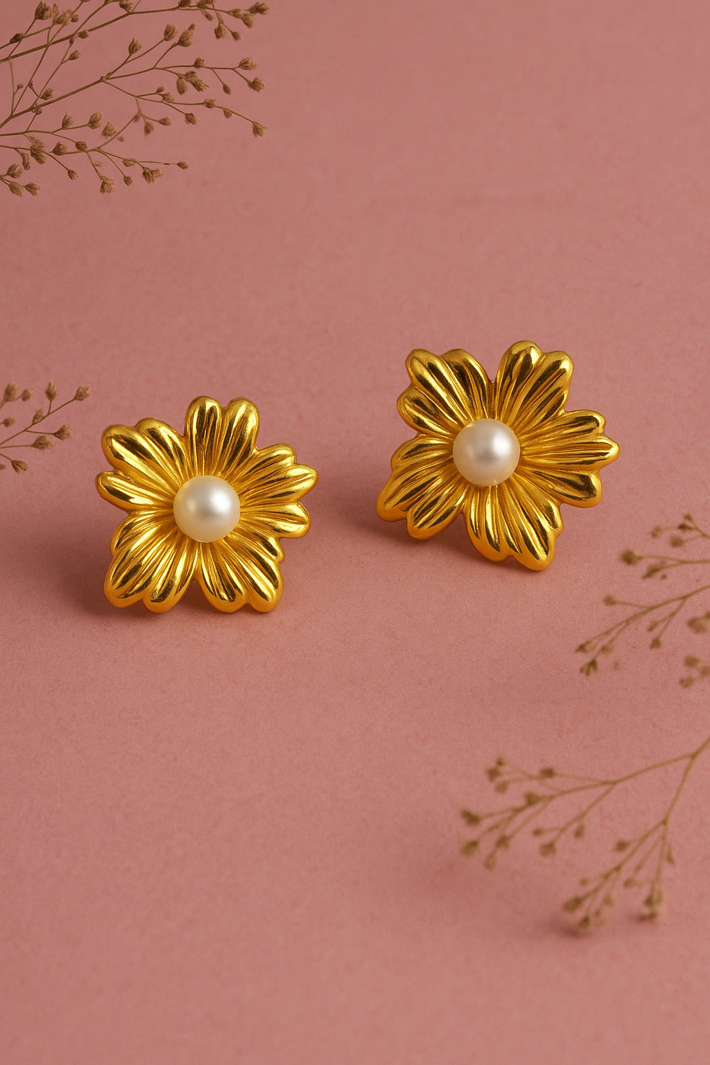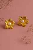 Charming golden floral studs featuring a delicate pearl. Ideal for ethnic & western outfits. Stylish, comfortable & elegant.