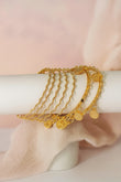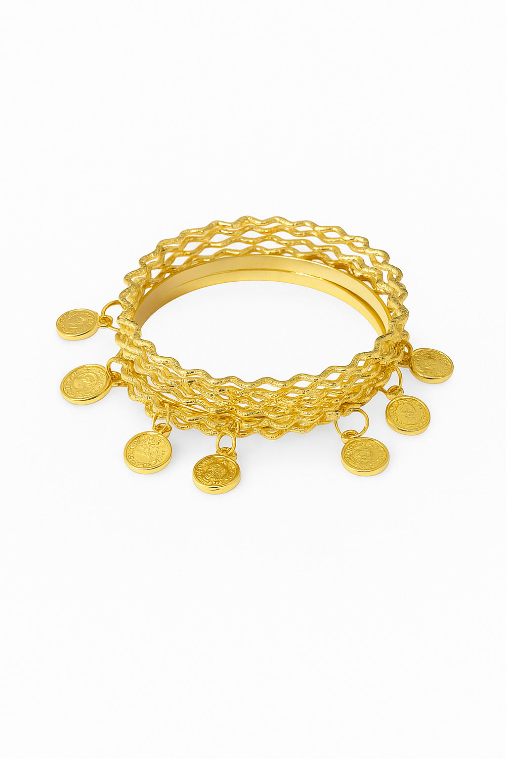 Stylish set of wavy gold bangles with intricate coin charms. Lightweight, durable, and perfect for ethnic as well as modern looks.