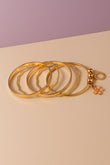 Chic set of gold-toned bangles featuring wavy texture and delicate hanging charms. Ideal for adding elegance to any outfit.