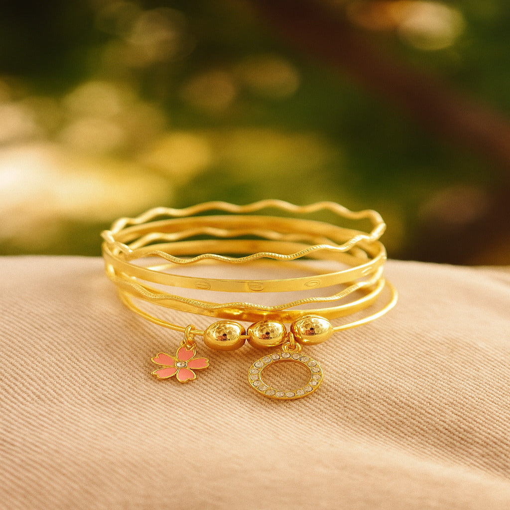 Women’s Gold Charm Bangles – Flower & Bead Design