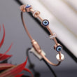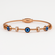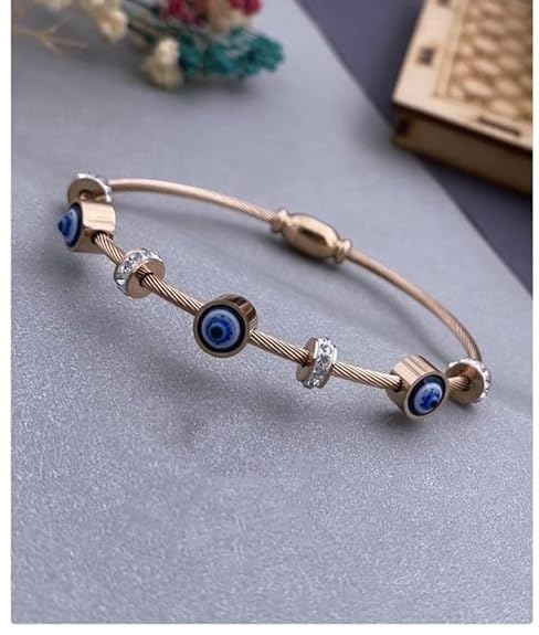 Fuse elegance with symbolism in this stunning rose gold cable bracelet featuring evil eye charms and shimmering crystal-studded beads. Its sleek, flexible cable design paired with meaningful detailing makes it a perfect everyday accessory or thoughtful gift.