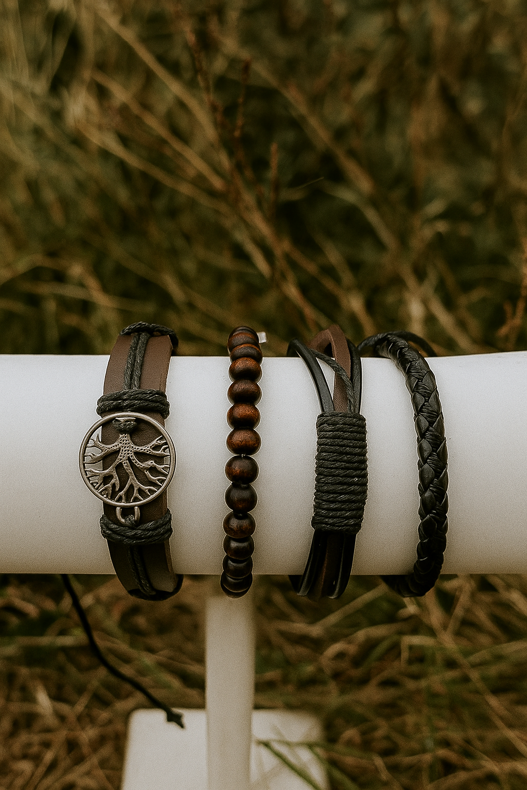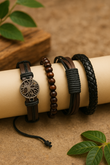 Stylish set of 4 bracelets featuring leather straps, braided design, brown beads, and a compass charm. Perfect for casual, party, or college wear and a great gifting option.