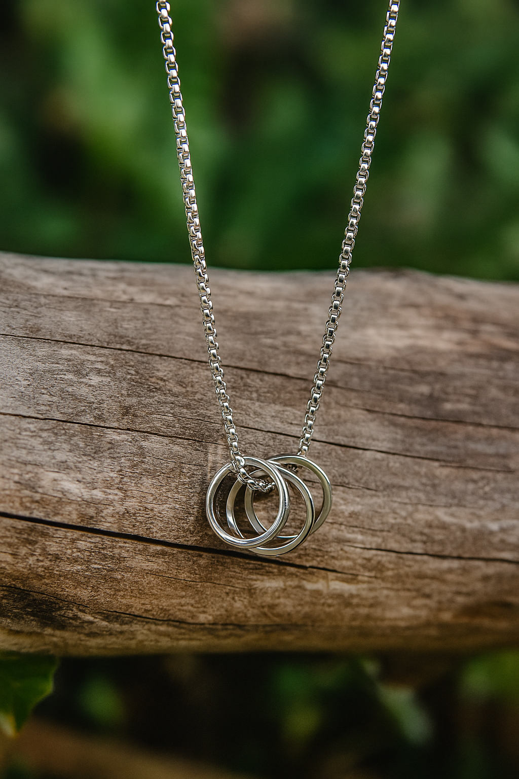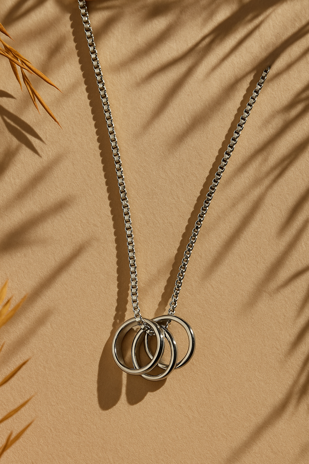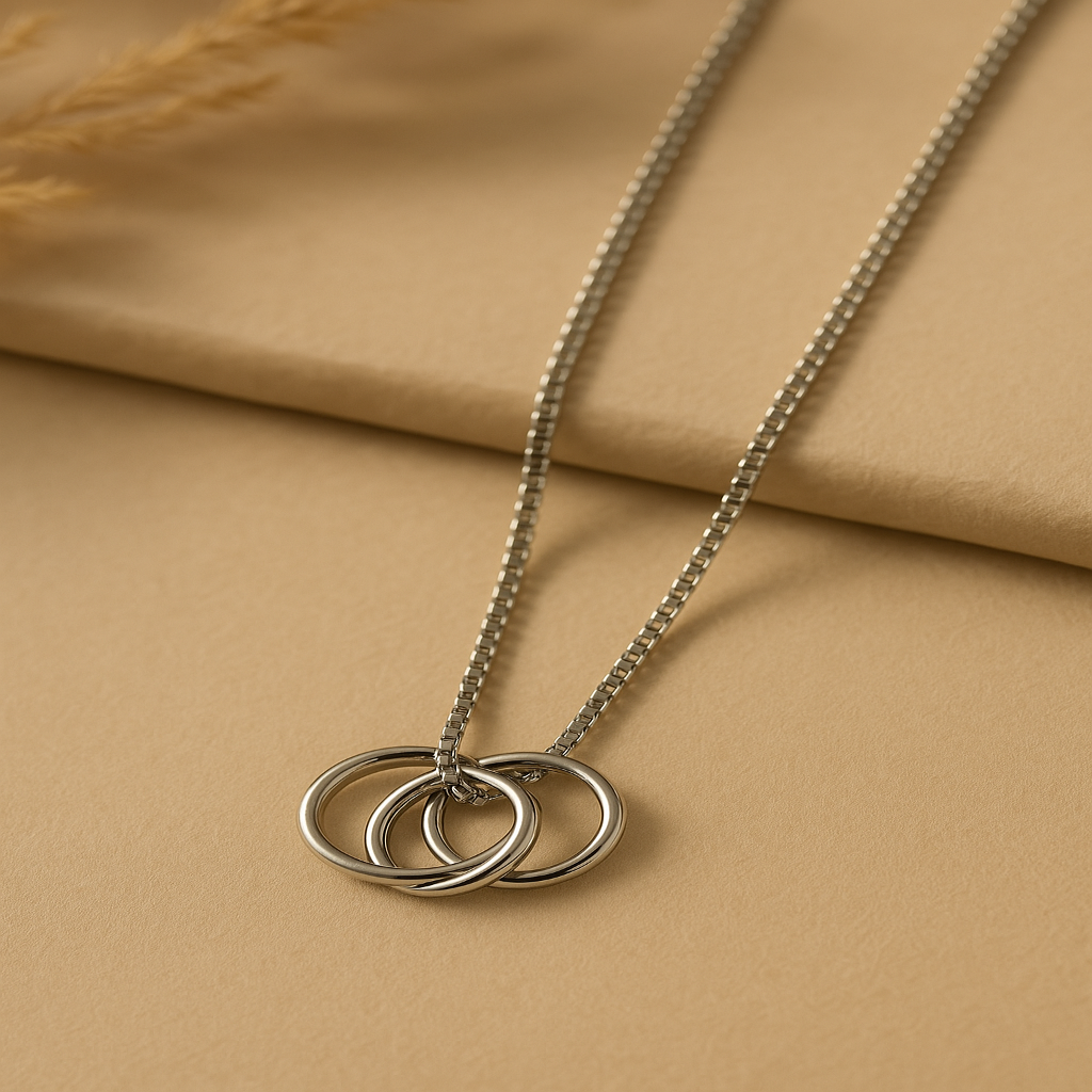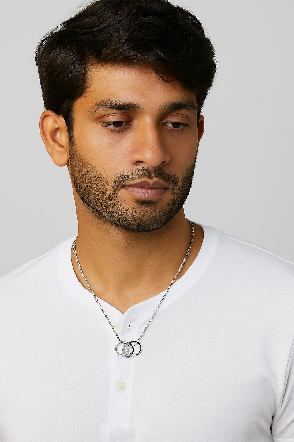 Add a touch of elegance with this Silver Chain Necklace featuring Interlocking Rings Pendant — symbolizing unity and love. Crafted with premium silver-tone polish and lightweight comfort, it’s perfect for men and women. Ideal for daily wear, parties, or gifting your loved one.