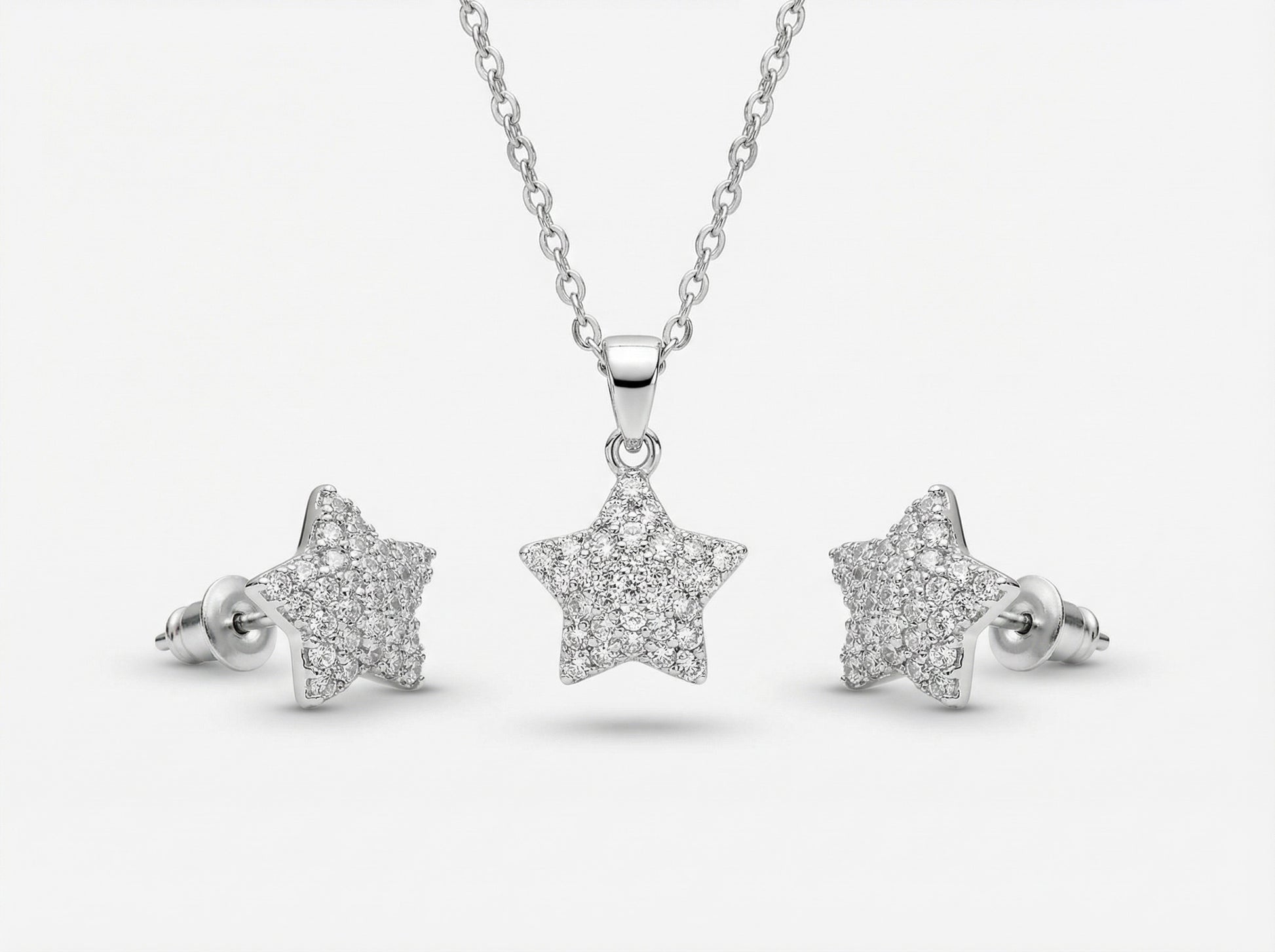 Elegant necklace set with sparkling star pendant and matching studs. Minimal yet statement jewellery ideal for casual outfits, parties, office wear and modern styling.