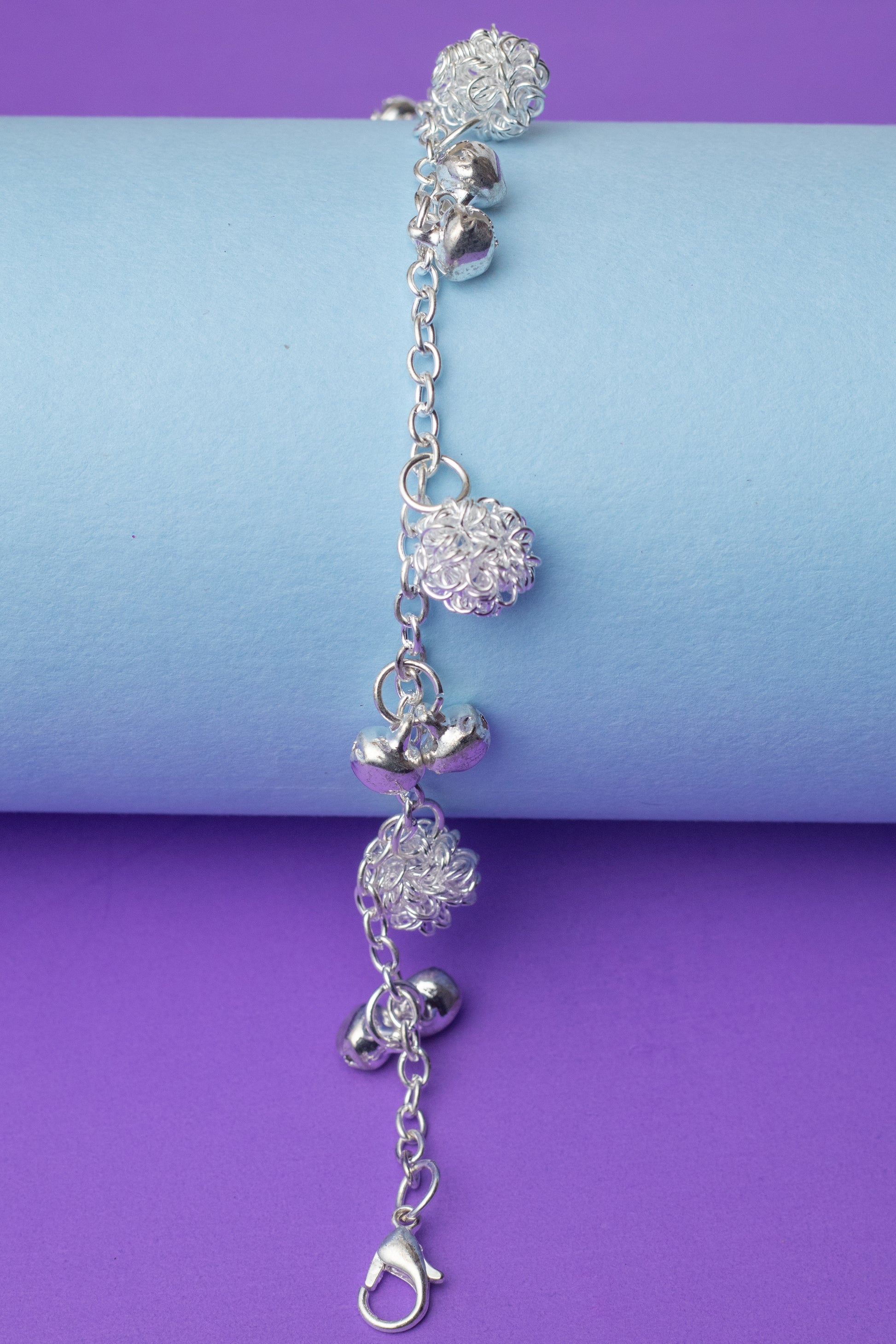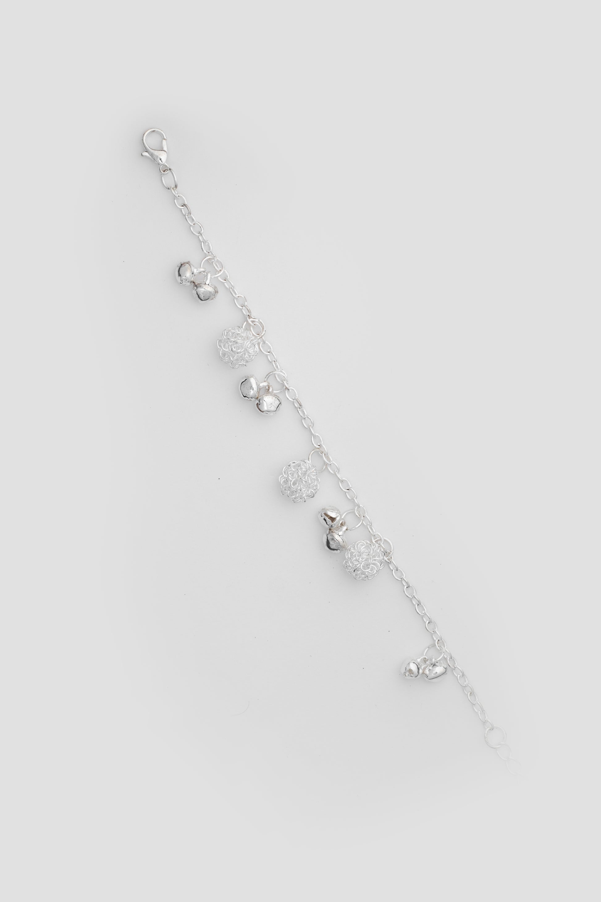 Add a playful sparkle to your wrist with this silver-toned bracelet featuring dangling textured beads and mini bell charms. Lightweight and chic, it’s perfect for everyday wear or adding a little jingle to your festive outfits.